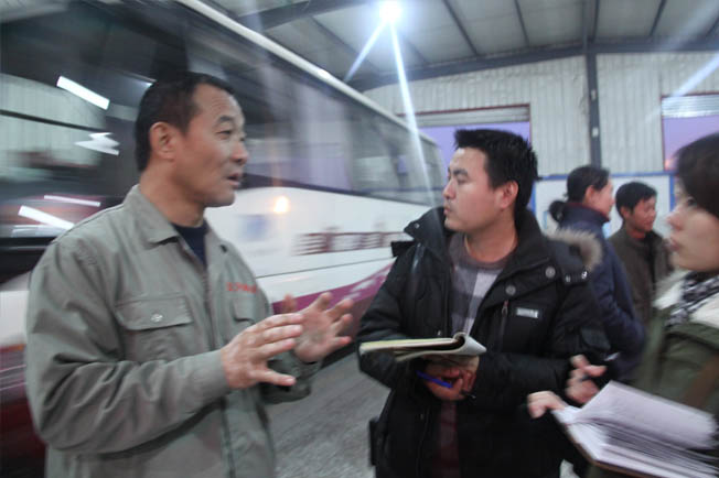 在濟(jì)宇汽車修理車間采訪小組成員在現(xiàn)場(chǎng)進(jìn)行采訪、拍攝