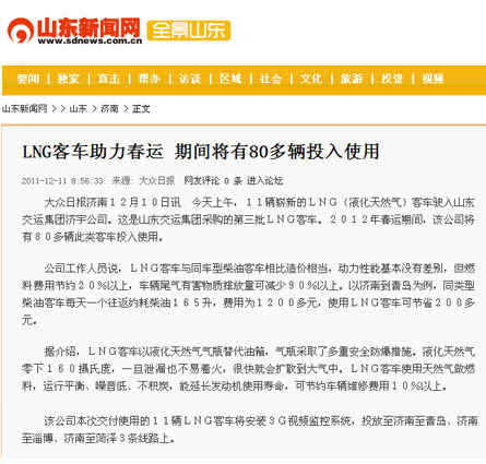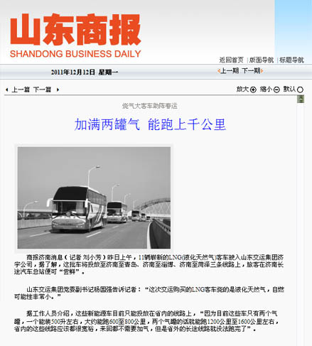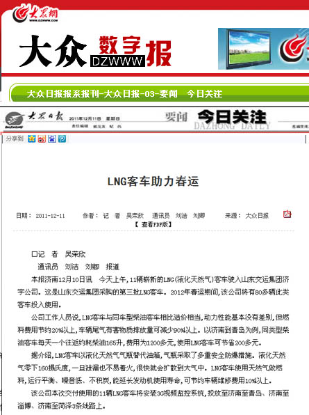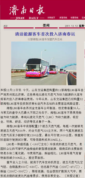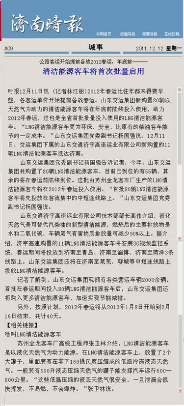 在采訪活動中,采訪團(tuán)深入蘇州金龍客車制造車間,觀看了車輛從車架組裝、整車陰極電泳到制動配制等流水制造的全過程,體驗了客車制造的嚴(yán)密工序;在金龍客車廠產(chǎn)品展室,記者們了解了蘇州金龍客車廠的發(fā)展歷史及企業(yè)安全文化,對燃?xì)馇鍧嵞茉纯蛙囁鶓?yīng)用的新技術(shù)、新工藝、新材料有了更進(jìn)一步的認(rèn)識;在蘇州金龍客車廠會議室,總工程師張衛(wèi)林將燃?xì)馇鍧嵞茉纯蛙嚺c汽油、柴油等能源客車進(jìn)行比對,向記者詳細(xì)介紹了燃?xì)馇鍧嵞茉喘h(huán)??蛙囋诎踩h(huán)保、節(jié)能等方面的優(yōu)勢;在“山東交運集團(tuán)清潔能源環(huán)??蛙嚱卉噧x式”上,各新聞媒體記者又對本次燃?xì)馇鍧嵞茉喘h(huán)??蛙囓囕v安全運營、節(jié)能減排、線路投放等情況,進(jìn)行了現(xiàn)場采訪和隨行拍攝。12月9日晚22點,集團(tuán)公司燃?xì)馇鍧嵞茉喘h(huán)??蛙囓囮牻?jīng)一路跋涉平安抵濟(jì),12月10日晚,省電視臺山東衛(wèi)視頻道在《新聞聯(lián)播》欄目、濟(jì)南市電視臺濟(jì)南新聞頻道在《濟(jì)南新聞》欄目以及《大眾日報》、《齊魯晚報》、《山東商報》、《生活日報》、《現(xiàn)代交通報》、《濟(jì)南日報》、《濟(jì)南時報》、《交通廣播》等媒體都對集團(tuán)公司燃?xì)馇鍧嵞茉喘h(huán)保客車投入春運情況進(jìn)行了重點報道。