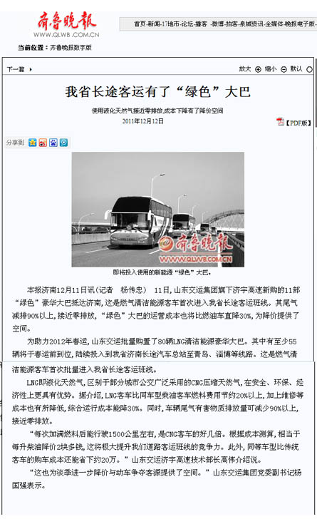 長期以來,集團(tuán)公司高度重視節(jié)能減排工作,積極利用培訓(xùn)、比賽等方式,解析節(jié)能方法,測定油耗標(biāo)準(zhǔn),推動節(jié)能減排工作深入開展。本次集團(tuán)公司濟(jì)宇高速新購進(jìn)11輛燃?xì)馇鍧嵞茉喘h(huán)保客車,是集團(tuán)公司調(diào)整車輛結(jié)構(gòu),優(yōu)化運輸組織,提高企業(yè)核心競爭力、創(chuàng)建節(jié)約型企業(yè)的戰(zhàn)略任務(wù)之一。是進(jìn)一步貫徹“兩保兩樹”和“對標(biāo)·精細(xì)化管理增效年”、“創(chuàng)先爭優(yōu),爭做交運先鋒”活動的重要載體,為積極做好本次接車新聞宣傳工作,集團(tuán)公司早部署早發(fā)動,認(rèn)真組織全面策劃,收集素材擬寫新聞通稿,多方聯(lián)系溝通協(xié)調(diào)。12月6日,集團(tuán)公司黨委副書記楊國強(qiáng)帶領(lǐng)山東電視臺、濟(jì)南電視臺、《大眾日報》、《齊魯晚報》、《現(xiàn)代交通報》、《濟(jì)南日報》、《濟(jì)南時報》、《交通廣播》等8家新聞媒體,以及黨委組宣部、濟(jì)宇高速相關(guān)工作人員,前往蘇州金龍客車廠,以“山東交運集團(tuán)80余部燃?xì)馇鍧嵞茉喘h(huán)保客車助力春運”為主題,進(jìn)行了全面深入的聯(lián)合新聞采訪。