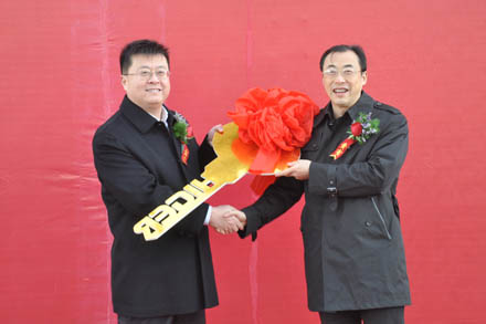 山東省交通運輸集團(tuán)有限公司黨委副書記楊國強(qiáng)(左)和江蘇金龍客車有限公司黨委書記、新能源客車公司總經(jīng)理謝飛鳴在交接現(xiàn)場。