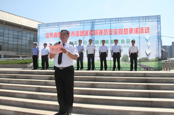 為貫徹落實(shí)國家安全監(jiān)管總局、交通運(yùn)輸部、公安部《關(guān)于在道路客運(yùn)行業(yè)深入開展駕駛員安全承諾和安全教育工作的通知要求》,山東省政府安委會于2015年6月12日組織開展了道路客運(yùn)駕駛員安全宣誓承諾活動。作為全省道路客運(yùn)的龍頭單位,集團(tuán)公司由安全總監(jiān)朱永順同志帶隊(duì),組成三個(gè)方隊(duì)參加了此次活動,駕駛員劉軍作為全省駕駛員代表宣讀了倡議書,并作為領(lǐng)誓人帶領(lǐng)現(xiàn)場400余名駕駛員進(jìn)行莊嚴(yán)宣誓。