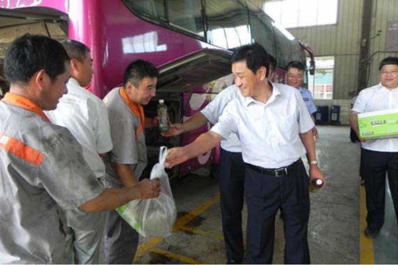 在汽車總站,吳董一行為奮戰(zhàn)在一線的員工送上內(nèi)含小風扇、毛巾、清涼油、藿香正氣丸等防暑降溫物品的“清涼包”,對各崗位員工在炎熱天氣里堅守崗位、無私奉獻的精神給予肯定和感謝, 鼓勵大家時刻保持干勁,在工作中多創(chuàng)佳績,同時一定要注意防暑,保證健康。座談期間,吳董詳細聽取了總站“三嚴三實”教育工作匯報,對黨建工作與生產(chǎn)經(jīng)營相結合等問題進行了指導,對下半年的各項工作提出了三點要求:一是要采用集體學習與個人學習相結合、與中心組學習相結合、與民主生活會相結合的方式,進一步抓好“三嚴三實”專題教育的學習和落實;二是開展“三嚴三實”專題教育要結合生產(chǎn)經(jīng)營實際,以“三嚴三實”理論為基礎、精神為統(tǒng)領,促進各項工作順利開展;三是總站領導班子要以身作則,無論在生活上還是個人修養(yǎng)上,都要起到引領示范作用,始終保持良好的精神狀態(tài),帶領廣大員工為完成全年工作任務而不懈努力。