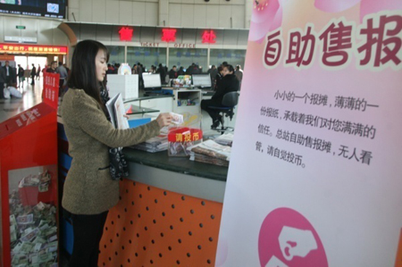 近日,濟南長途汽車總站在候車大廳設(shè)立了自助售報點,發(fā)售《齊魯晚報》、《濟南時報》、《都市女報》等省內(nèi)各大報紙,由旅客誠信購買,吸引了不少旅客關(guān)注,很多人被這小小售報點傳遞出的誠信與公德的展現(xiàn)所感染,自覺投幣買報。