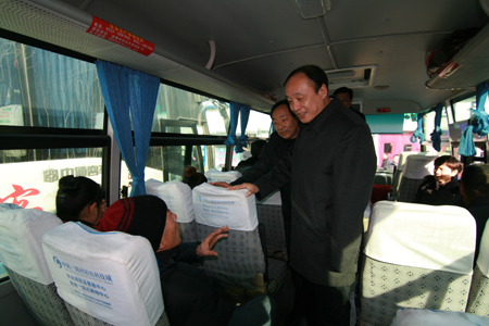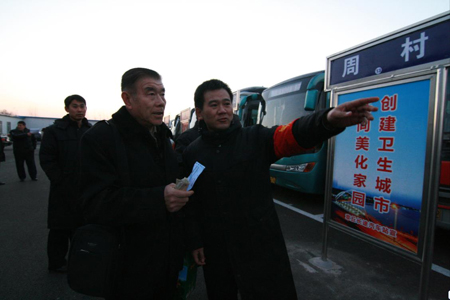 章丘市市委書記江林(右一)在章丘客運站臨時站與乘客親切交談。