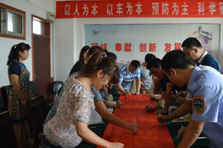 近日,第三客運(yùn)公司舉行了《控事故·治違章·安全管理提升月》活動(dòng)啟動(dòng)儀式。活動(dòng)由安全生產(chǎn)事故警示教育培訓(xùn)周、隱患排查治理周、應(yīng)急預(yù)案演練周和安全生產(chǎn)知識(shí)競(jìng)賽四項(xiàng)活動(dòng)組成。計(jì)劃在8月份,第三客運(yùn)公司將集中開(kāi)展應(yīng)急預(yù)案演練、強(qiáng)化隱患排查治理、宣傳法律法規(guī)等活動(dòng),通過(guò)隨車(chē)行、GPS監(jiān)控、教育培訓(xùn)等手段,加強(qiáng)宣傳“強(qiáng)化紅線意識(shí)、促進(jìn)安全發(fā)展”和“一崗雙責(zé)、綜合治理”的理念,達(dá)到嚴(yán)控違章駕駛等違規(guī)行為,杜絕較大以上行車(chē)責(zé)任事故的目標(biāo)。其中,在8月13日開(kāi)展安全生產(chǎn)宣傳咨詢(xún)?nèi)掌陂g,公司全體職工參加了安全知識(shí)小競(jìng)賽、安全謎語(yǔ)猜猜看、安全小知識(shí)普及、安全演講等一系列宣傳咨詢(xún)活動(dòng),聆聽(tīng)了《生命是花,安全是根》演講,職工們積極參與活動(dòng)的各個(gè)環(huán)節(jié),氣氛熱烈,最后大家在橫幅共同簽字,表示將居安思危,防微杜漸,推動(dòng)公司安全生產(chǎn)工作穩(wěn)定發(fā)展。