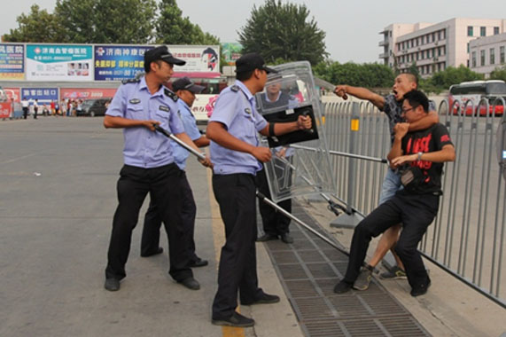 演練模擬從發(fā)現(xiàn)持械可疑人員進(jìn)入車站開始,按照應(yīng)急預(yù)案,各部門迅速進(jìn)行實戰(zhàn)狀態(tài),各負(fù)其責(zé),分頭疏散現(xiàn)場車輛和旅客,防止次生隱患的發(fā)生。治安人員利用反恐器械合力將歹徒制服,并通過一鍵報警系統(tǒng)報警,配合民警將歹徒扭送至車站派出所進(jìn)行處理。