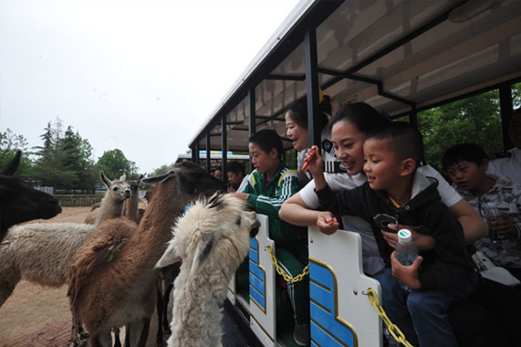 在建成不久的新濟(jì)南野生動(dòng)物世界,福娃們?cè)凇皭坌陌謰尅钡募?xì)心呵護(hù)下,乘坐小火車觀光游覽,與野生動(dòng)物“親密接觸”,零距離觀察和了解麋鹿、斑馬、駱駝等動(dòng)物的生活環(huán)境與生活習(xí)性,并興致勃勃地觀看了精彩紛呈的動(dòng)物表演,歡樂的笑聲回蕩在整個(gè)公園。