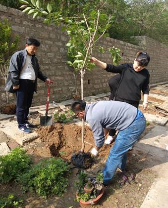 在黨支部書記的帶領下,黨、團員青年明確分工、齊心協(xié)力、鼓足干勁、揮鍬培土、栽下新苗。每道工序都做得認真細致,一絲不茍。植樹現(xiàn)場,處處是忙碌的身影,汗水伴隨著歡笑聲,構(gòu)成一幅熱火朝天的勞動景象。經(jīng)過2個多小時的辛勤勞動,16株海棠、櫻花和薔薇樹苗昂然挺立,在匡山大院落地生根。