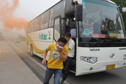 演習期間,模擬進行了車輛運行中突然起火后的乘客疏散、逃生、火災撲救等科目。自駕駛員發(fā)現(xiàn)起火,到開啟應急燈車輛緊急停靠,打開應急逃生門,指揮疏散到全部乘員疏散完畢,整個過程歷時3分鐘;隨后,駕駛員利用車載滅火器,對車輛著火部位進行了撲救和報警求救等,所有演練科目歷時30分鐘。通過本次消防演練活動,使駕駛員的安全防范意識和滅火能力都有進一步的增強,對消防安全常識有了進一步的了解,對車輛發(fā)生火災事故時的自救能力、逃生能力都得到了一定的提高。